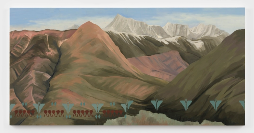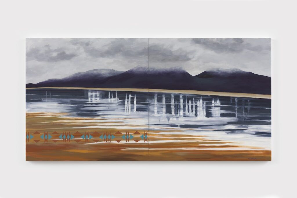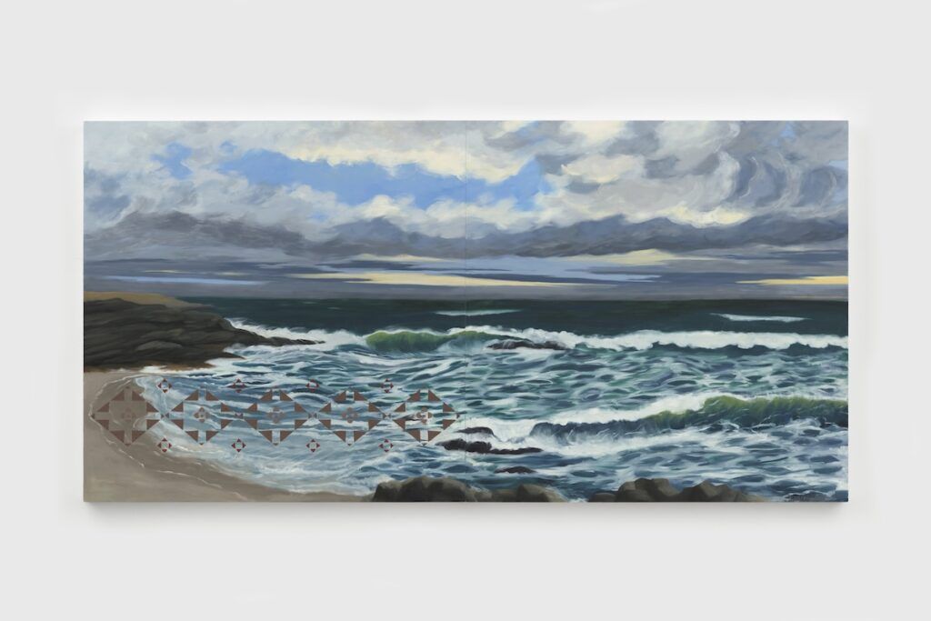 In Wampanoag Coast, Variation II, for example, a turbulent seascape of blue-green waves under a cloud-swept sky, WalkingStick reminds viewers that the former Indigenous inhabitants of this particular coastline may no longer be evident. By floating a pattern associated with Native pottery and textiles on top of the image, she conveys that their memory cannot be erased. The painting is included in the New-York Historical Society’s 2023 exhibition, “Nature, Crisis, Consequence.” The curators selected work that addresses the social and cultural impact of environmental crises on different U.S. communities throughout history.
