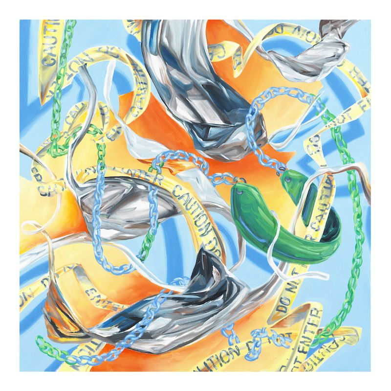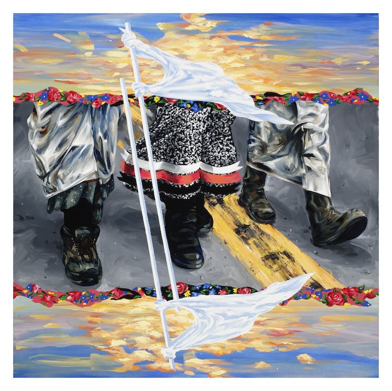 Much of the artwork Fields produced in 2017 reflects his experience at Standing Rock. Paintings such as Samí Solidarity (Standing Rock) and White Buffalo Calf Women’s March (Standing Rock) highlight his ability to make powerful, explicitly figurative work. Fields is equally comfortable morphing figurative elements into symbolic abstract forms, like those in Caution.