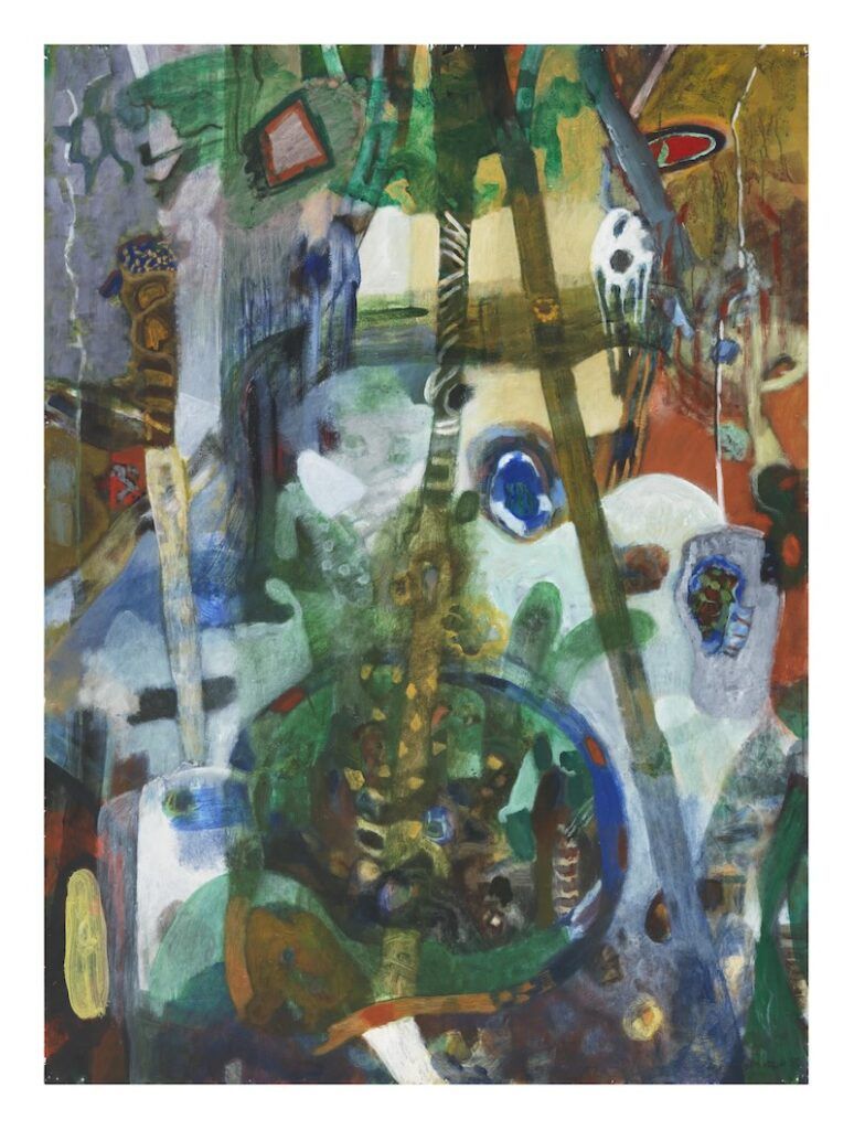 Others, like Mario Martinez, adopt an artistic vision that appears to be integrated with a decidedly 20th-century Abstract Expressionist stance. Although we can find elements in his painting akin to the energy of Willem de Kooning (Dutch-American, 1904–97) or the flittering forms reminiscent of Arshile Gorky (Armenian-American, 1904–48), Martinez says, “I’m part of a 40,000-year tradition.” In his studio, Martinez seamlessly integrates pre- and post-colonial American painting traditions. His memories of ancestral lands still linger, and they’re now enveloped by his experiences visualized in paintings of his adopted New York City home.